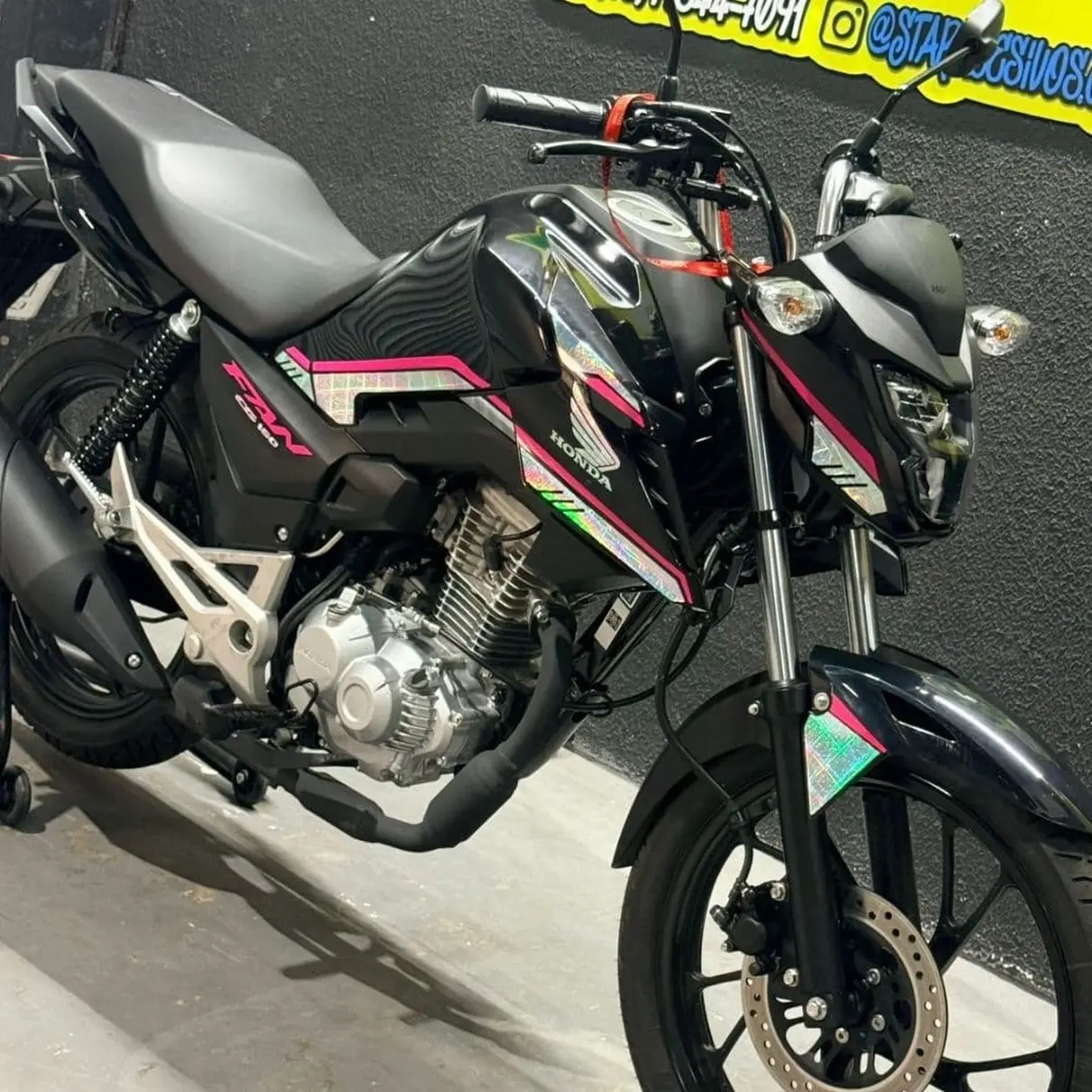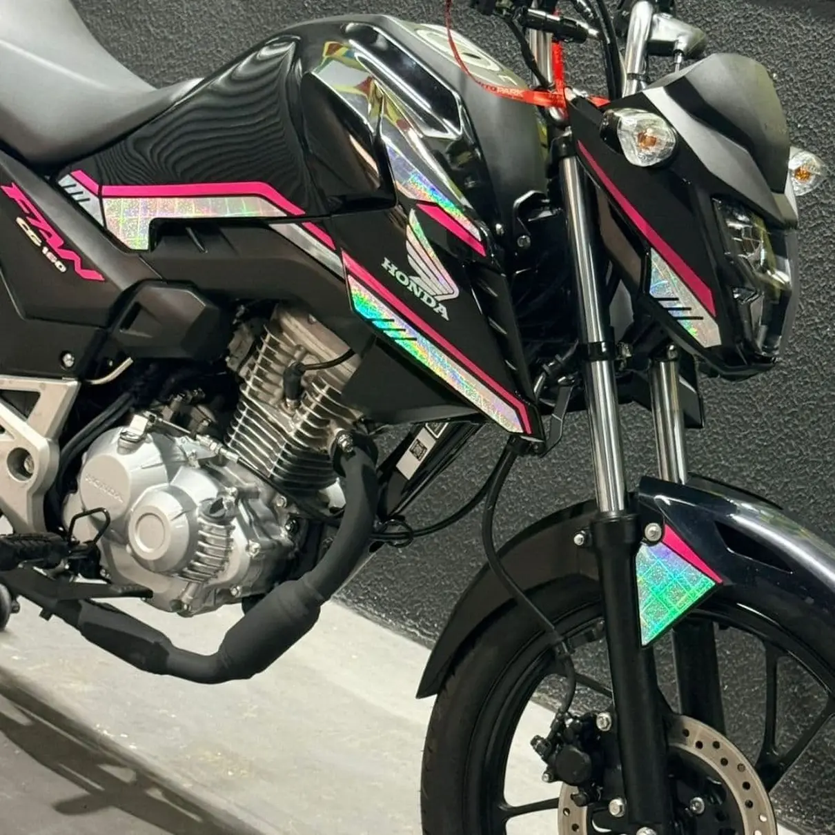O Kit Completo inclui todos os adesivos mostrados na foto, proporcionando uma transformação completa para sua moto.