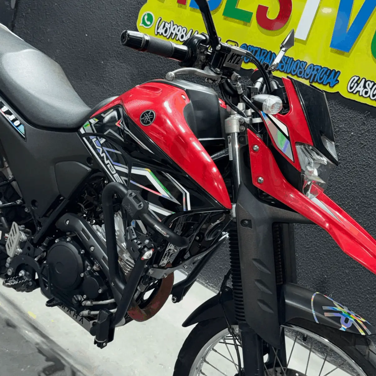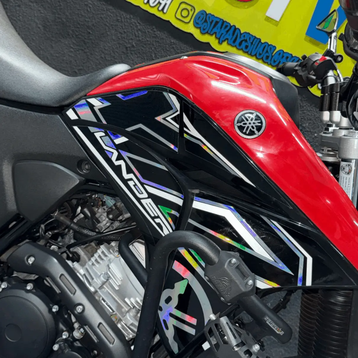 O Kit Completo inclui todos os adesivos mostrados na foto, proporcionando uma transformação completa para sua moto.