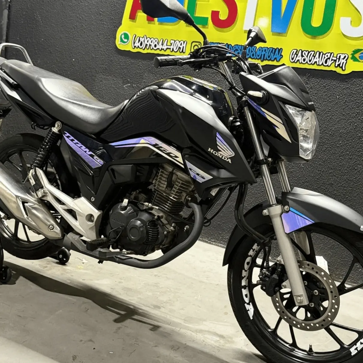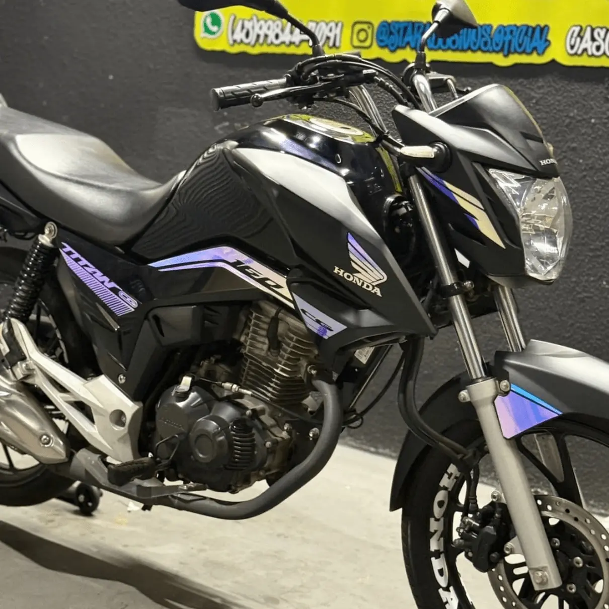 O Kit Completo inclui todos os adesivos mostrados na foto, proporcionando uma transformação completa para sua moto.